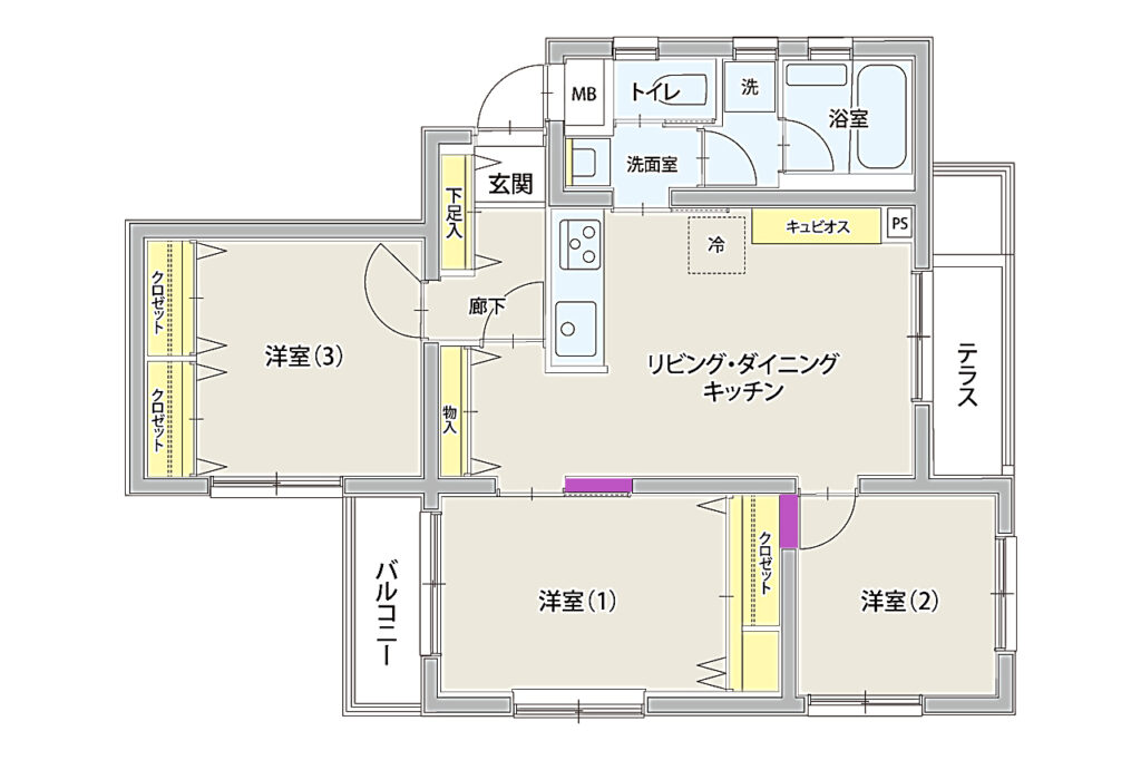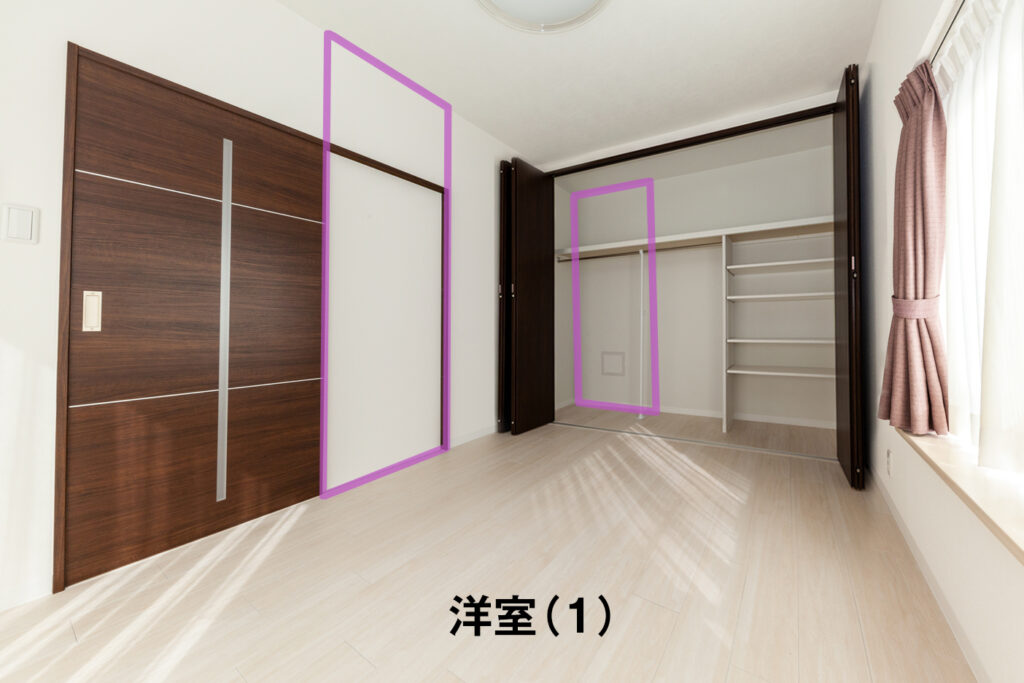 グレーの壁は全て構造壁ですので、洋室(1)と洋室(2)をどの様に使うかを考える事になります。