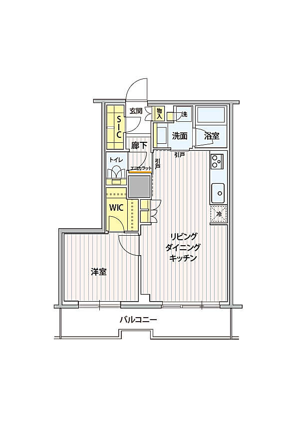 廊下を無くした分、洗面脱衣室とキッチンが近くなる。開き扉から引き戸に変更するが、2名家族のため問題なし!