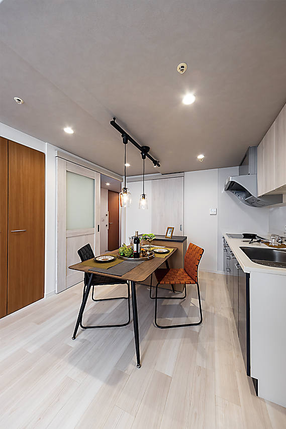 キッチン天井クロスの色を落とすことで、リビング空間を広く見せています。