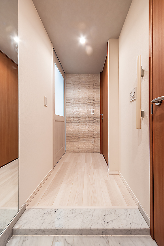 玄関のグレード感UPと、消臭・調湿効果を期待して、エコカラットを玄関の正面に設置。