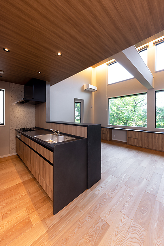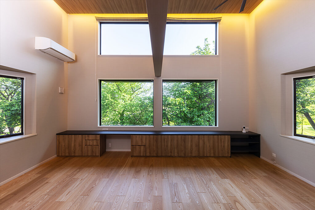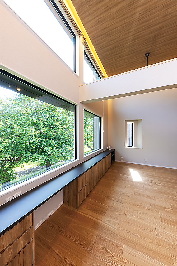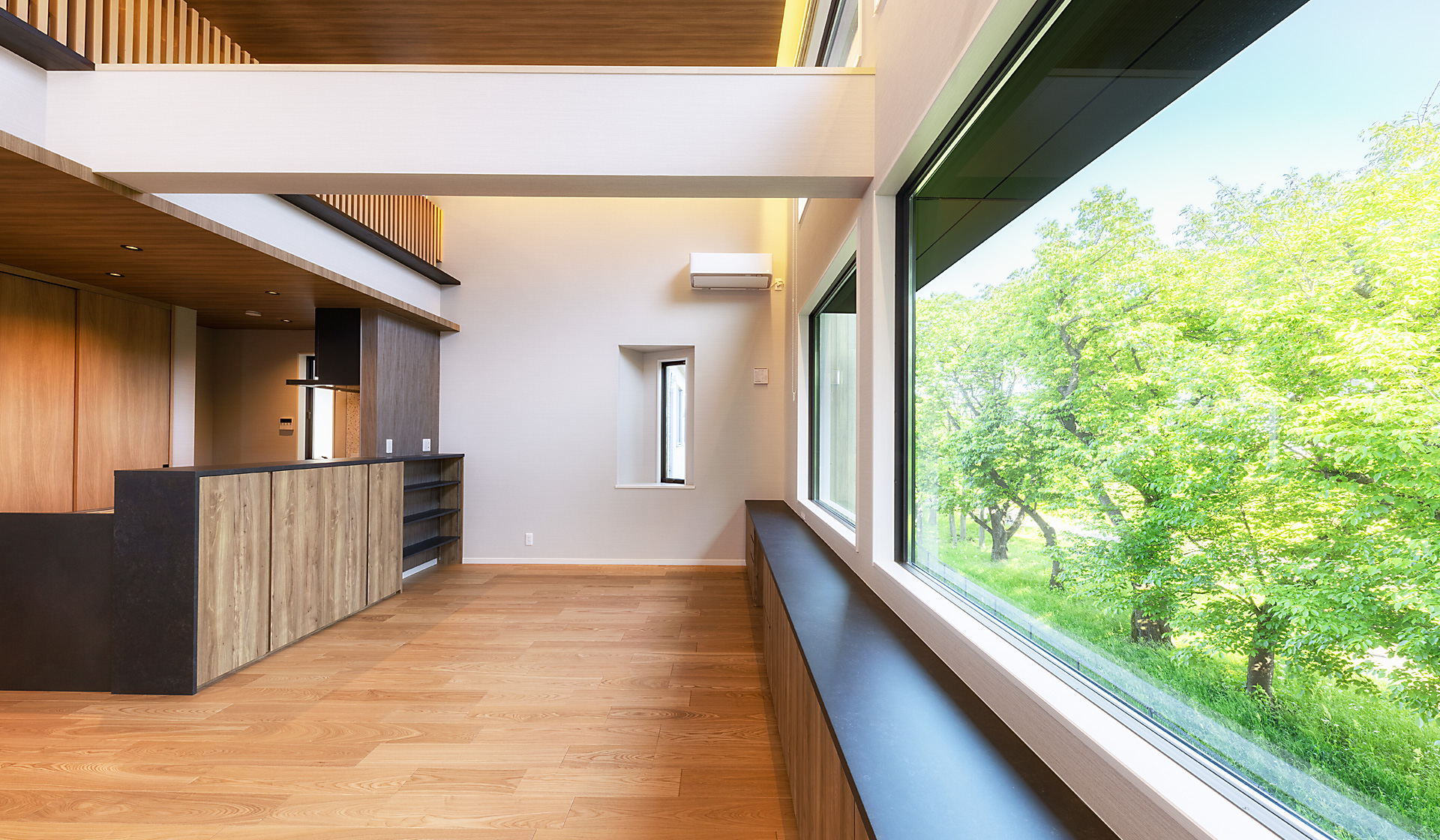 リビング天井高さ4m南面に、大開口・側面に斜め出窓で180度景色を楽しむ。