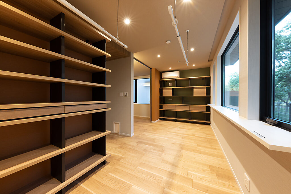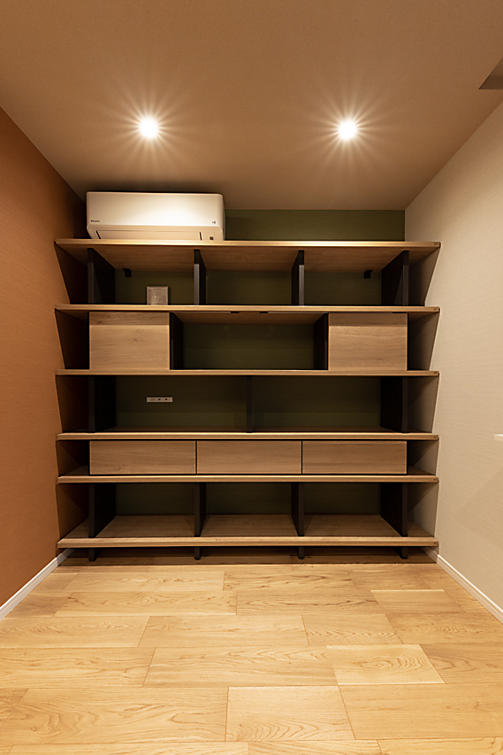 仕事部屋にはデザインされた本棚を設置、インテリアテイストを統一しました。壁クロスベースは1つ、ポイントクロスのトーンは同一自然色(木目・緑・土色・橙・黄土色など)です。