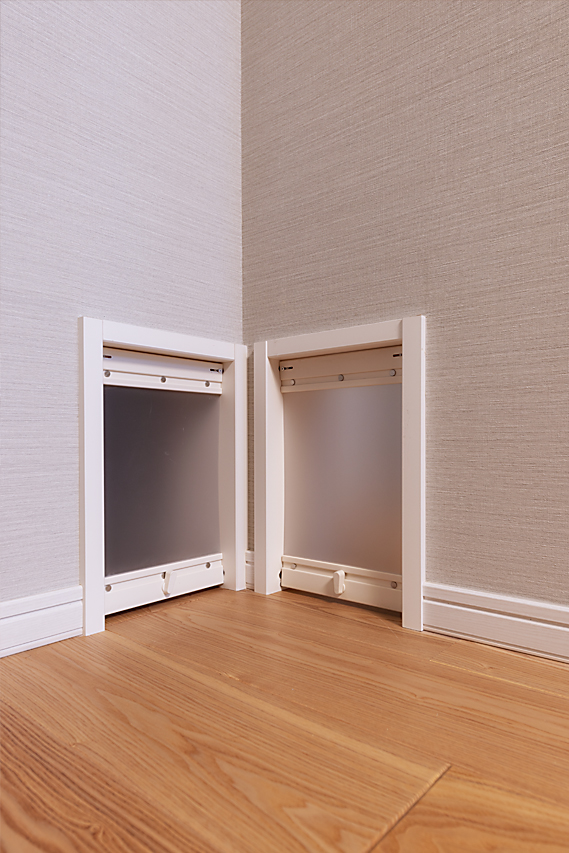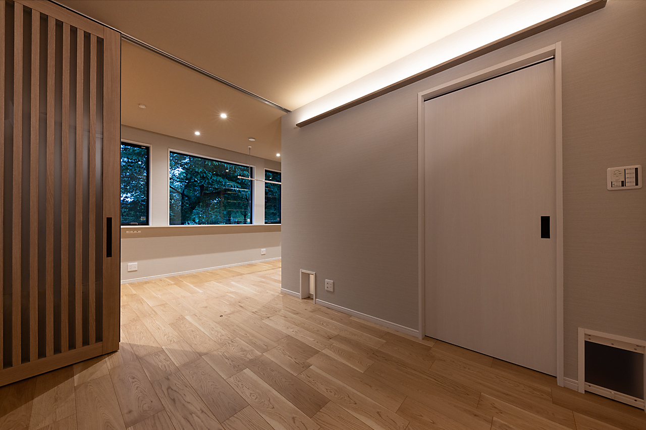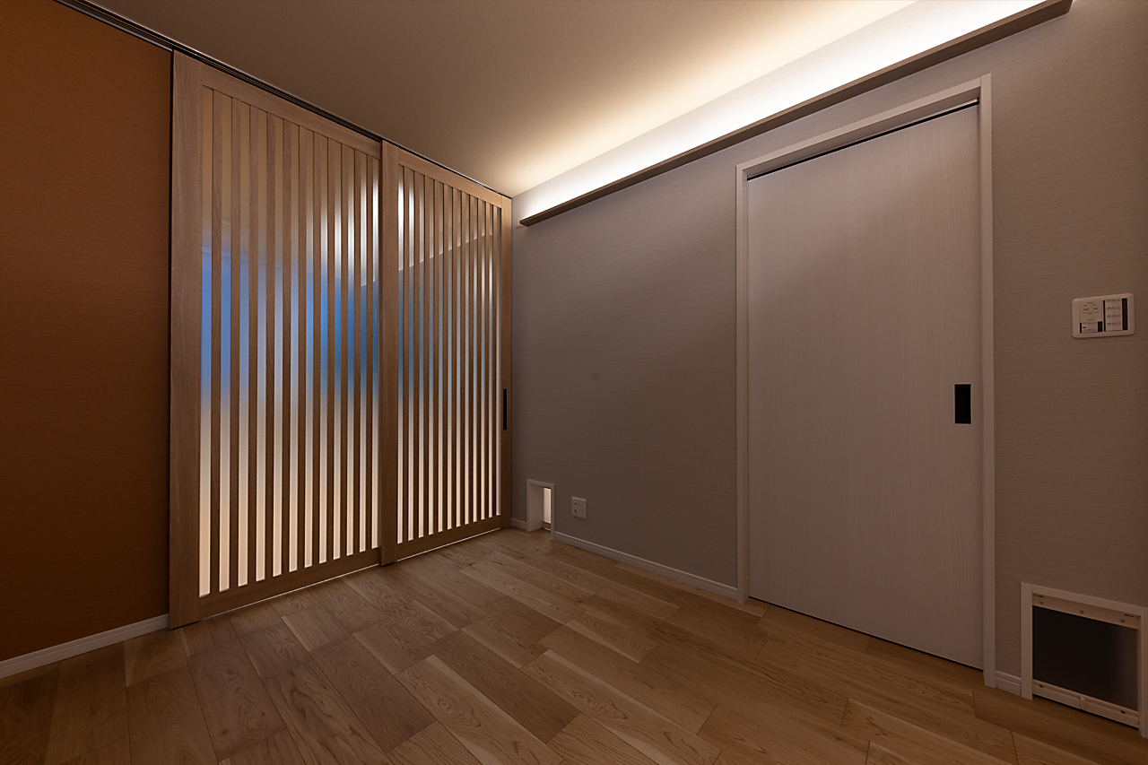 寝室の照明も照度調節可能な間接照明がメイン。ドア横には猫出入口。