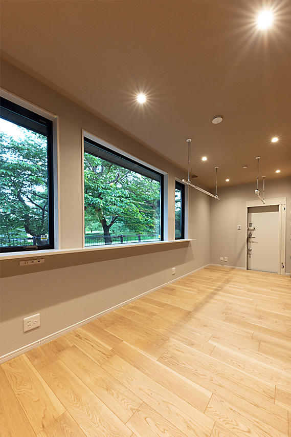 バルコニーは無し(室内干し、乾燥機)として建物を公園側ギリギリに。